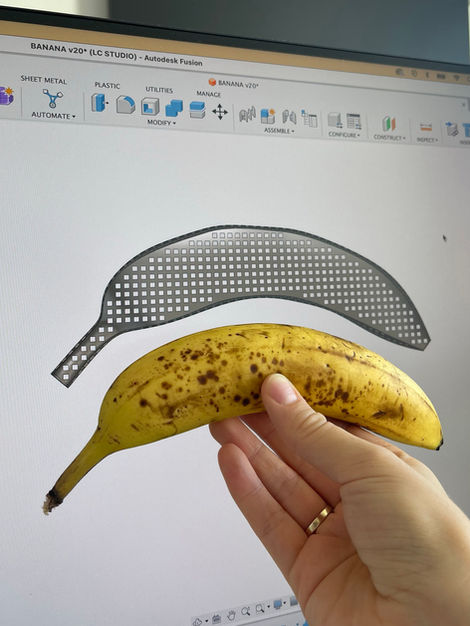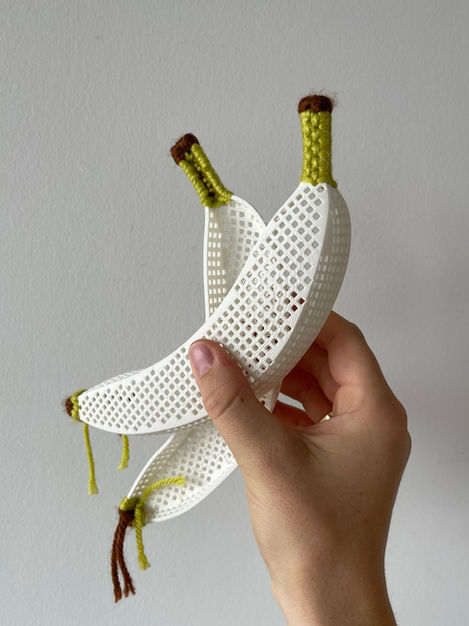 Here are several images of the process, which are a good illustration of my design process lately, both for my own projects and freelance projects. I bought a banana as a reference, photographed it, 3D modelled the shape and perforated the model for embroidery. I then 3D printed the pieces to test it and realized that the profile needed to be more rounded so I modified the model and printed it again. I then selected yarn colours and stitched the full shape, creating an integrated hinge on the back so that the basket opens.